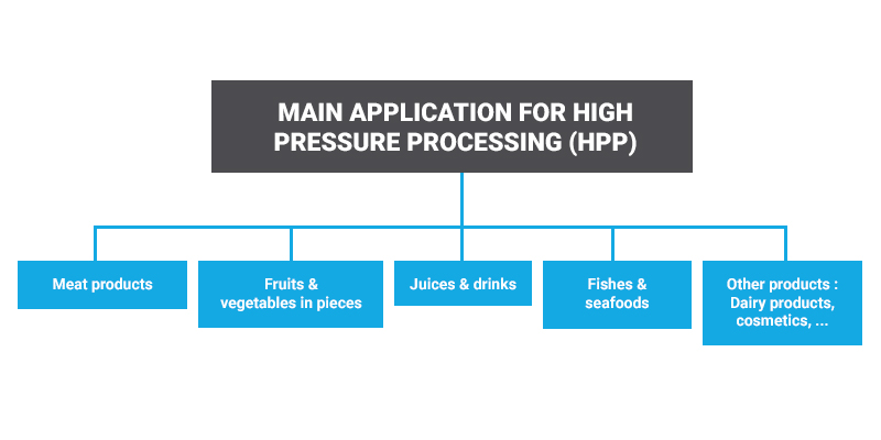 This Technology is used for the meat-based products meat and delicatessen, fruits and vegetables in pieces or puree, juices and drinks, seafoods and fishes, as well as some dairy products.